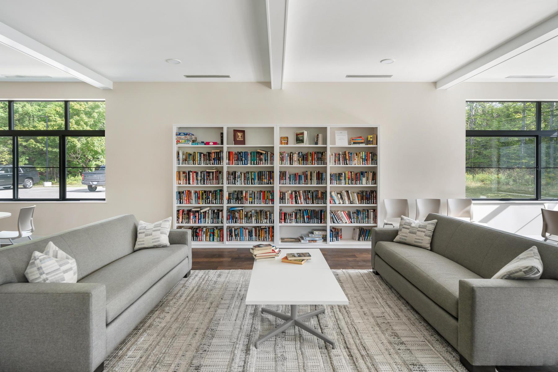 The inviting living area features plush leather seating, vaulted ceilings, a large flat-screen TV, and a well-stocked bookshelf — perfect for relaxing after exploring nearby beaches, towns, or trails. The updated kitchen is equipped with stainless steel appliances, a wine cooler, and everything you need for at-home meals. (The fireplace is inoperable.)