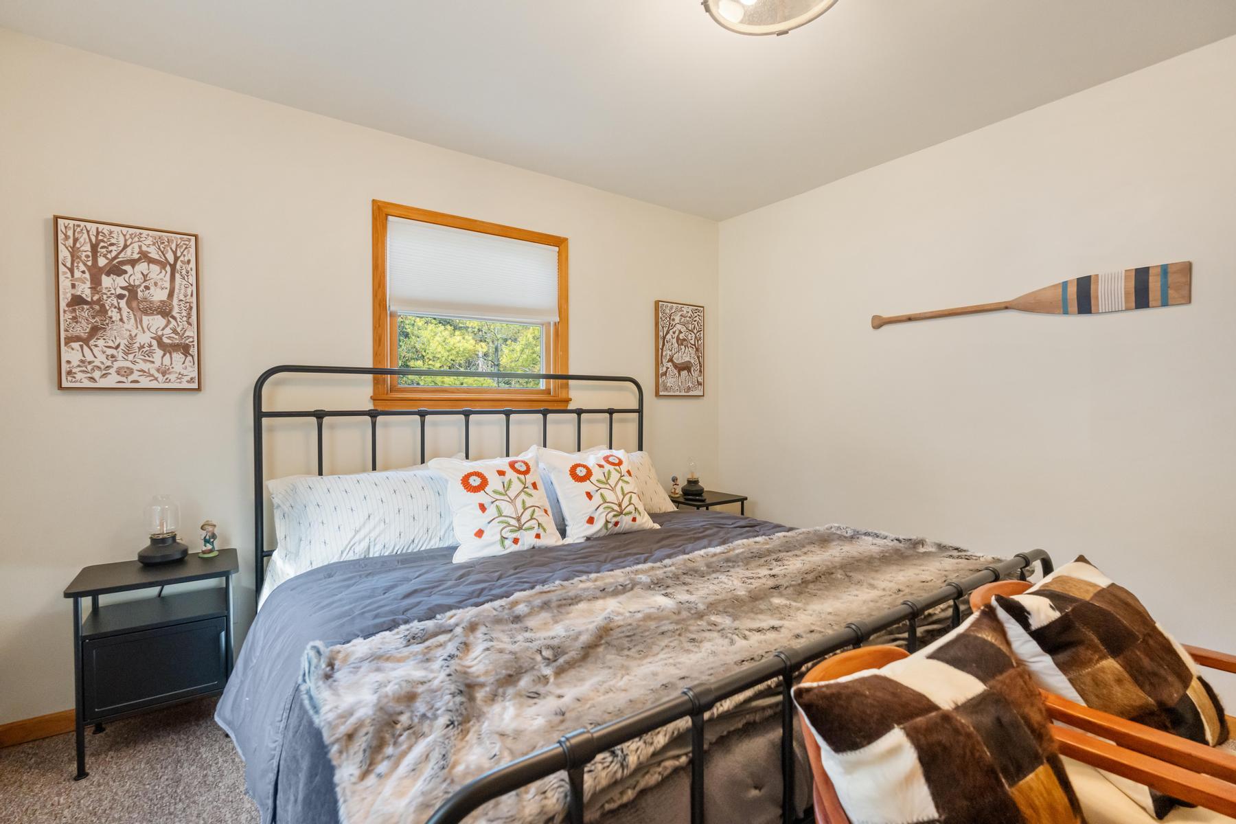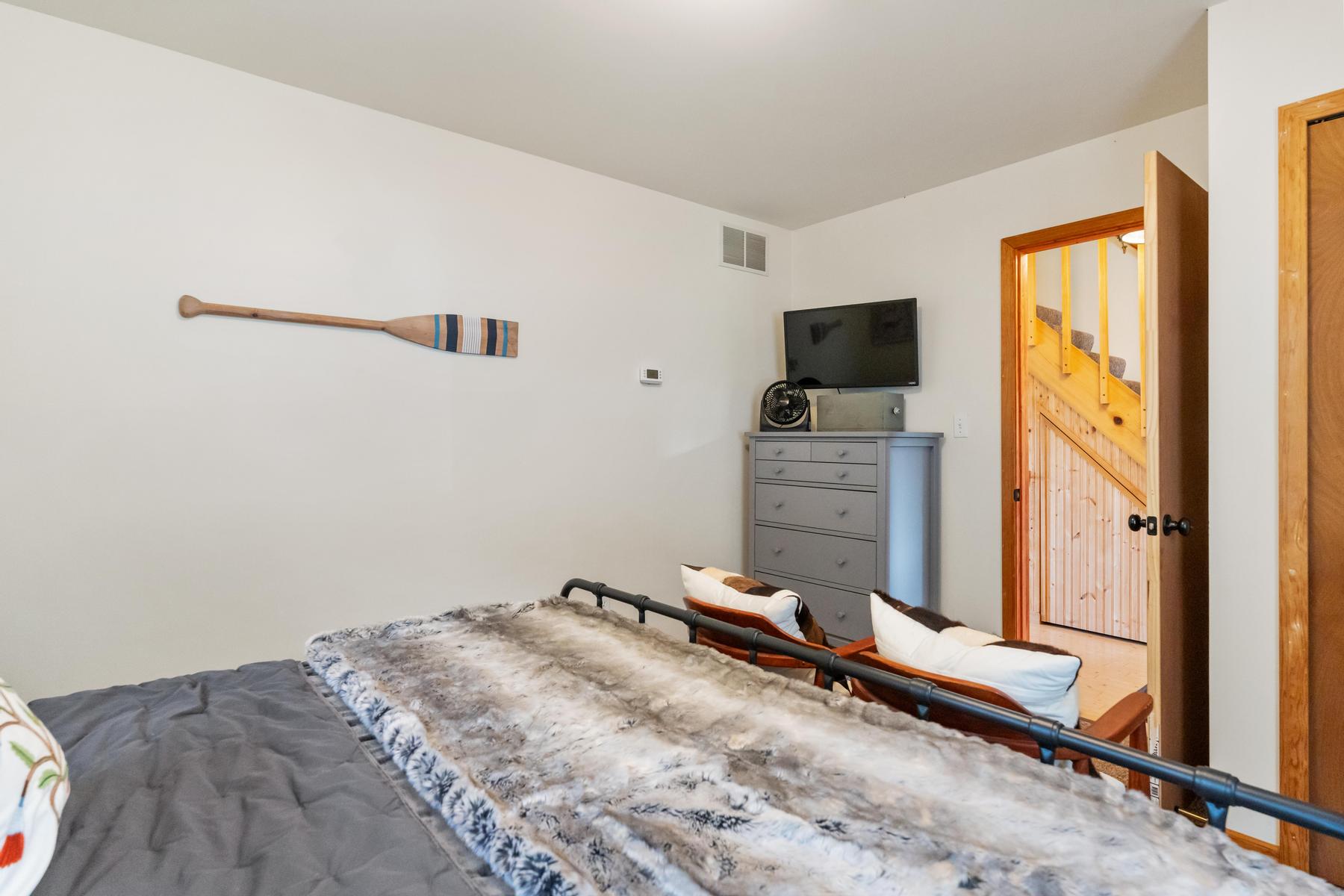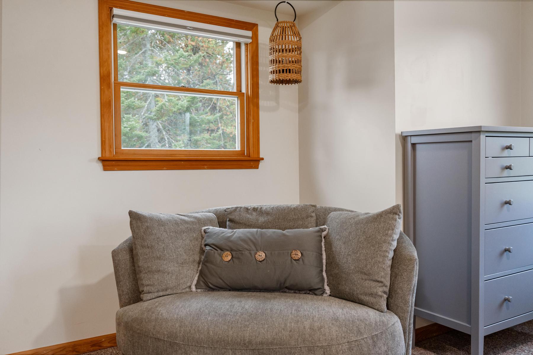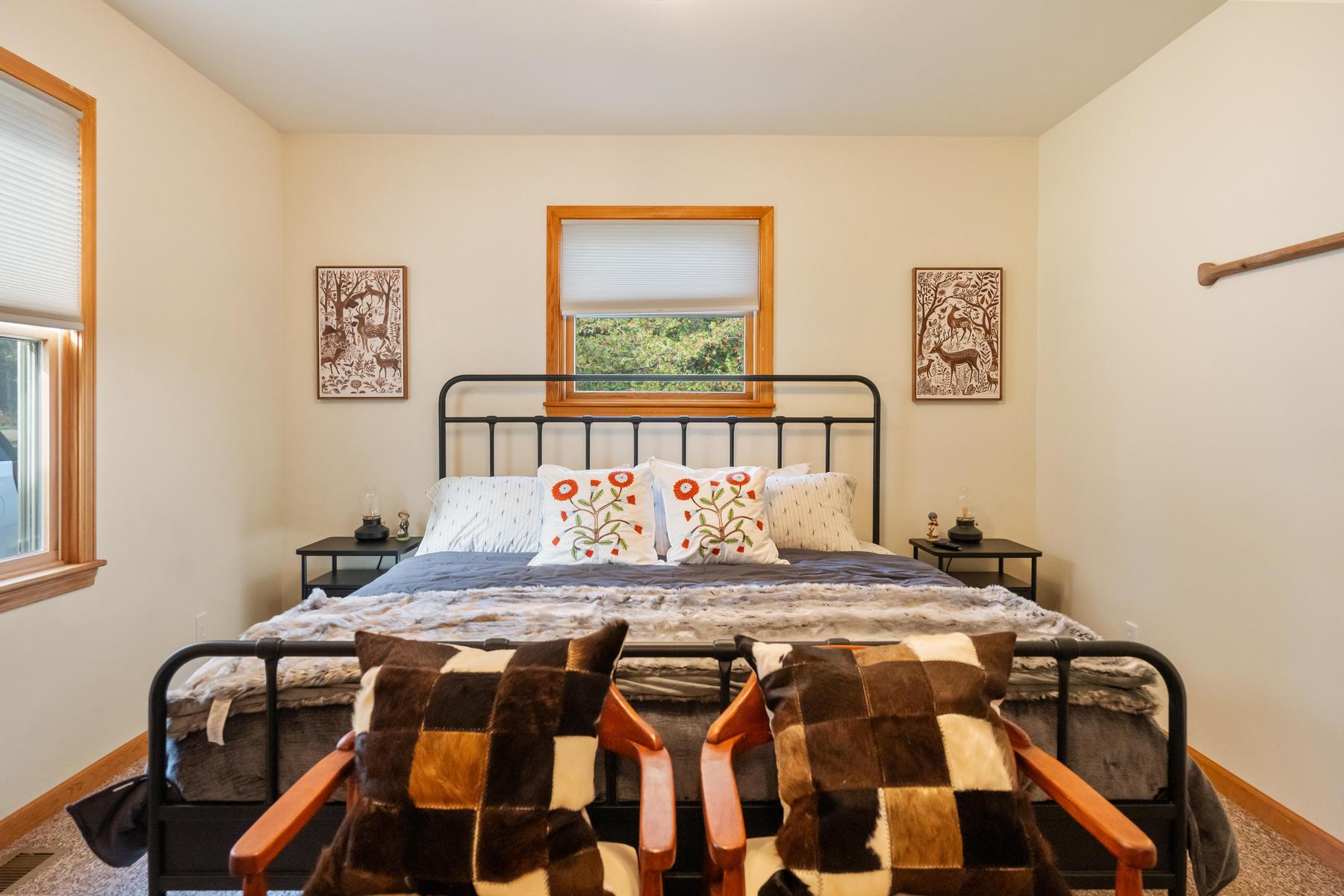Inside, the main level features a cozy king bedroom with a full bathroom just across the hallway. When you head upstairs, you’ll find two distinct areas. On one side is a versatile bedroom with two desks and chairs—perfect for remote work or creative pursuits—and a twin sofa sleeper for added flexibility. On the opposite side, the third “bedroom” features a king bed and is open to the stairway, without a door. While this space offers plenty of privacy from the lower level, the second bedroom door would need to be closed for complete privacy. A full bathroom is conveniently located within the king bedroom area for added comfort.